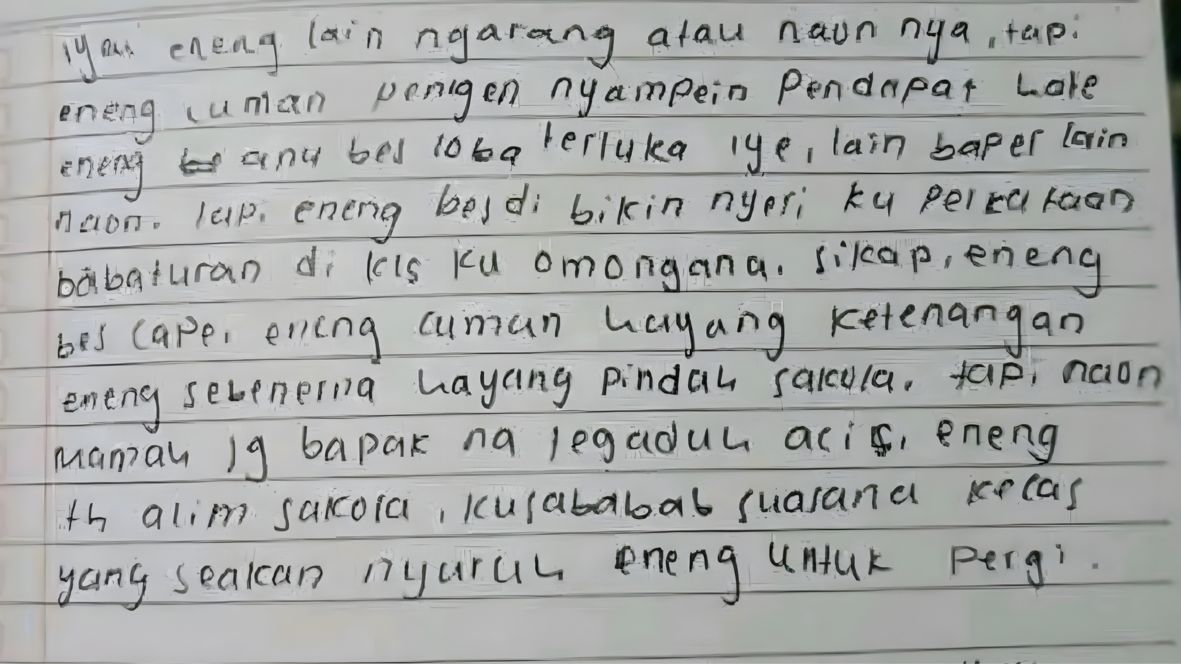 “Eneng cuma pengen nyampein pendapat, eneng nyeri ku perlakuan batur di kelas, ku omonganana, sikap…” begitu salah satu potongan isi surat yang ditemukan di dekat jasadnya.