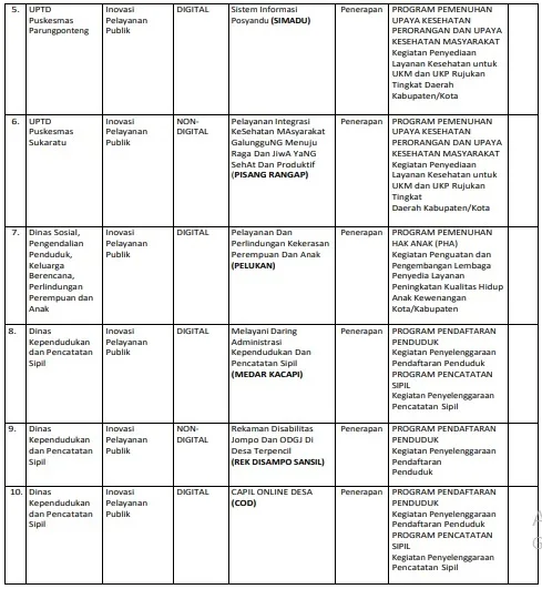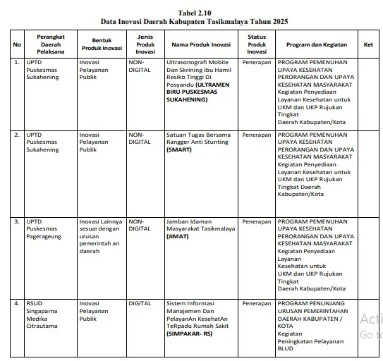 Berdasarkan Database Inovasi Daerah, Kabupaten Tasikmalaya memiliki inovasi sebagai berikut :