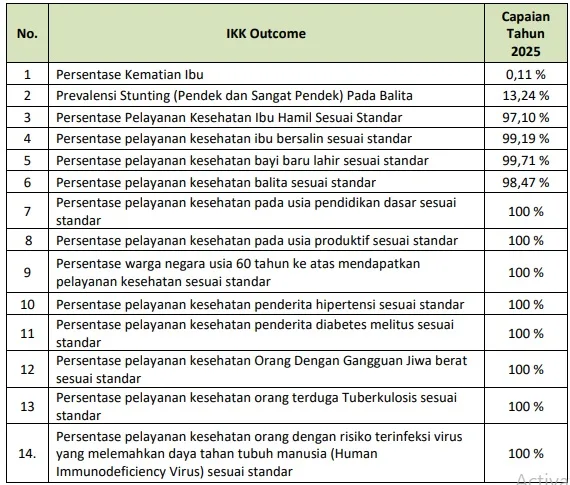 Capaian kinerja urusan kesehatan di Kabupaten Tasikmalaya pada Tahun 2025 diukur berdasarkan Indikator Kinerja Kunci (IKK) yang telah ditetapkan. Indikator tersebut digunakan untuk menilai tingkat keberhasilan penyelenggaraan urusan kesehatan dalam meningkatkan derajat kesehatan masyarakat.