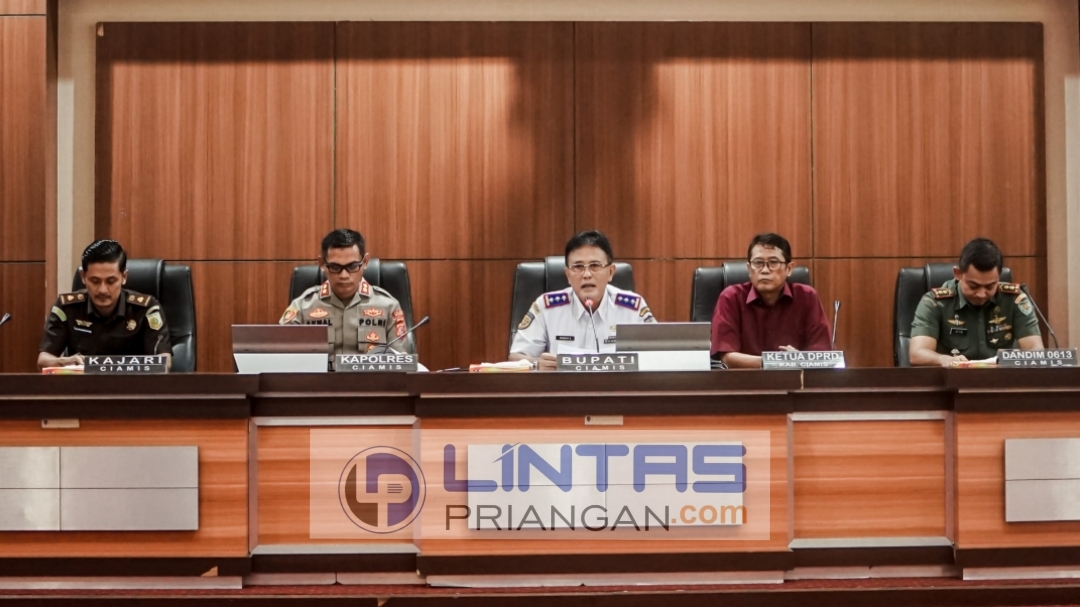Rakor Persiapan Pengamanan Hari Raya Idul Fitri 1446 H/2025 M ini dihadiri oleh unsur Forkopimda, para Kepala Organisasi Perangkat Daerah (OPD), Camat, Danramil, Kapolsek se-Kabupaten Ciamis, juga diikuti para Kepala Desa dan Lurah secara virtual dari kantor masing-masing. (Nank/lintaspriangan.com)