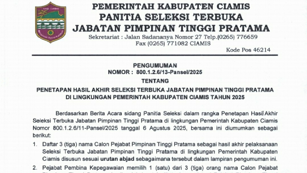 lintaspriangan.com. CIAMIS. Pemerintah Kabupaten Ciamis melalui Panitia Seleksi Terbuka Jabatan Pimpinan Tinggi Pratama (JPTP) resmi mengumumkan hasil akhir seleksi terbuka untuk pengisian enam formasi jabatan di lingkungan Pemerintah Kabupaten (Pemkab) Ciamis, Selasa (06/08/2025).